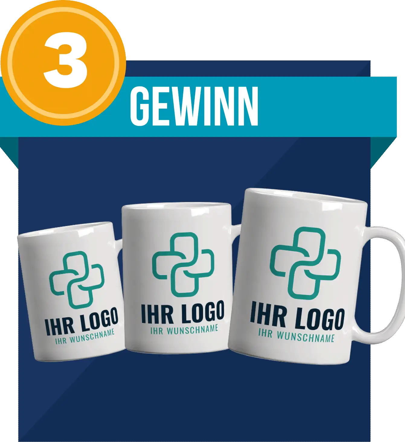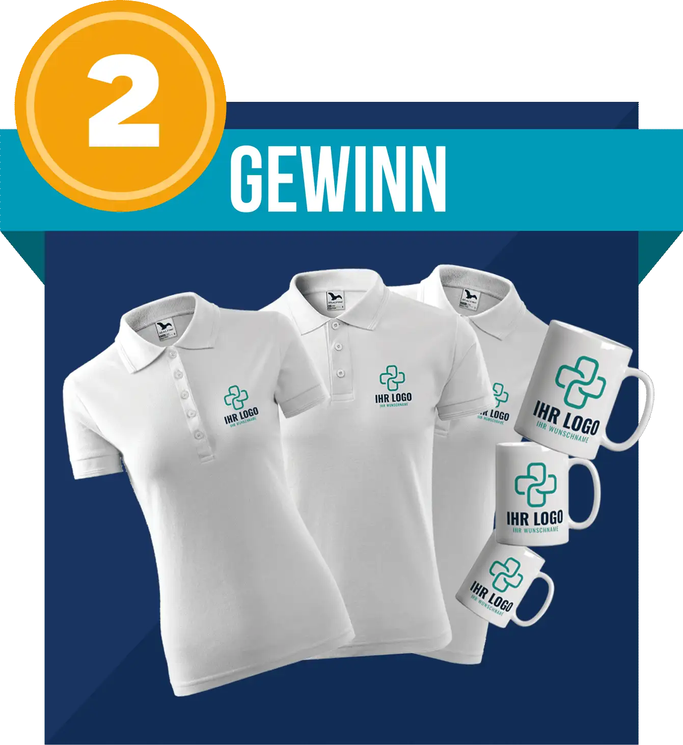Sichert dir diese 3 bequemen Polo Shirts mit eurem Praxislogo und zusätzlich 3 personalisierte Tassen für dich und deine Kollegen oder Kolleginnen. Auf alle Gewinne drucken wir natürlich euren Wunschnamen.